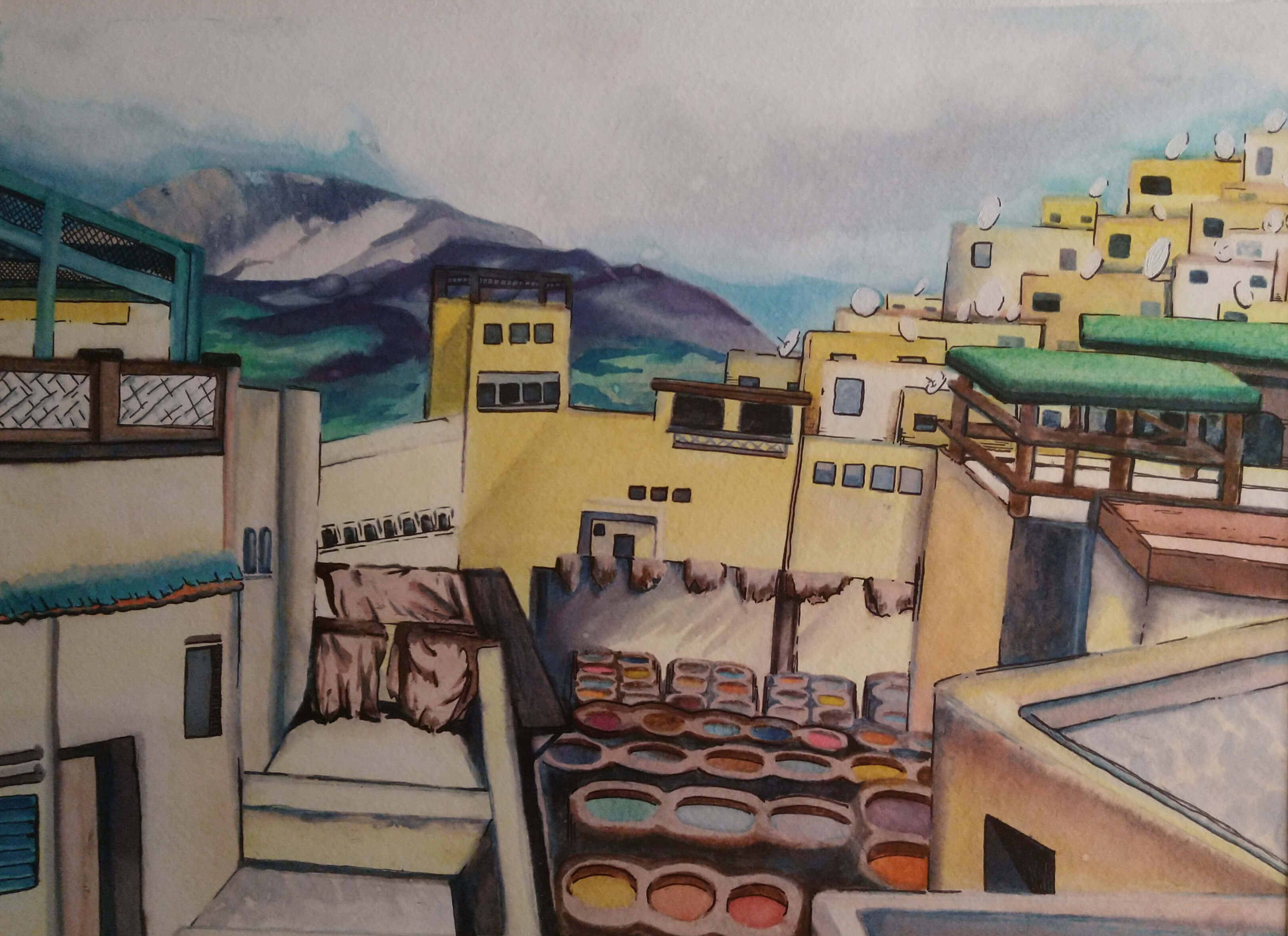 The Tanneries of Fes, 2018, Watercolor and Ink